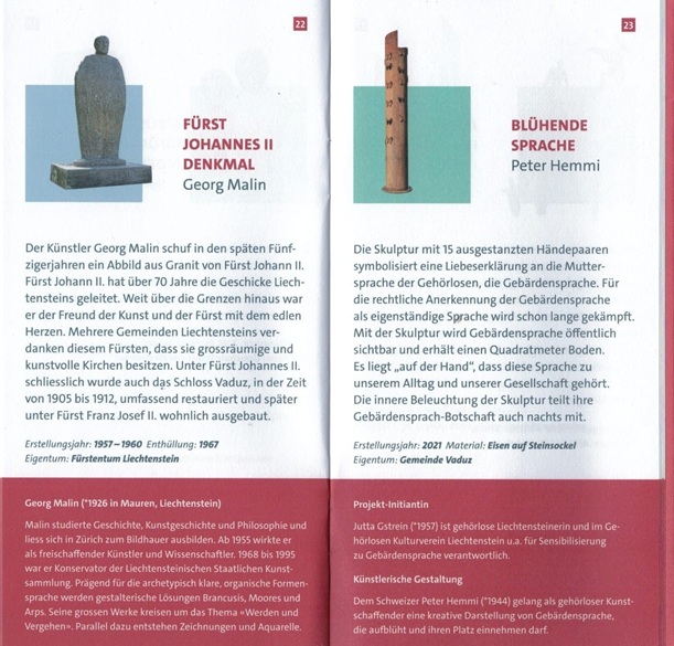 Der Gehörlosen Kulturverein Liechtenstein (GKVL) freut sich über die neue Broschüre mit Informationen über öffentlich ausgestellte Kunstwerke in Vaduz, denn sie beinhaltet auf Seite 23 auch eine Skulptur unseres Vereins: «Blühende Sprache – eine Liebeserklärung an die Gebärdensprache». Sie steht für Kommunikation und unsere Muttersprache, denn sie zeigt Hände, welche in Gebärdensprache kommunizieren.
