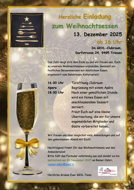 Das Jahr neigt sich dem Ende zu und wir freuen uns, Euch zu unserem Weihnachtsessen einzuladen. Geniesst ein festliches Beisammensein mit köstlichem Essen, organisiert vom Gehörlosen Kulturverein!